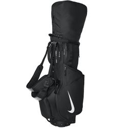 This versatile Golf Bag, made from 100% polyester. It features a 14-way divider main compartment with 7 pocketst and detachable, anatomically correct Nike Air Max dual straps for balanced carrying. The pocketes are perfect for waterproof fleece-lined valuable pocket, water bottle pockets, full-length apparel and glove pockets, range finder/GPS pocket and insulated cooler pocket. The golf bag is highlighted by a contrast welded Swoosh logo and measures 36"h x 15.1"w x 10.6"d, with a capacity of 5,762 cu. in./94.4 L.